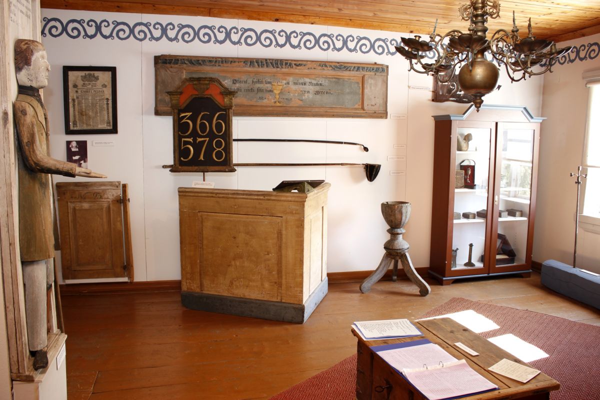 The church museum was renovated in 2004. The rarest and most significant items are a colourful and beautiful pulpit with its roof from the end of the 61st century. and a stand for a font - marbled with blue paint - which has the first been mentioned in the church inventory catalogue in the year 1737. There is also a church officer's stand and sifra sign, for which candidates of confirmation donated the numbers in 1775, an altarpiece depicting the crucifixion of jesus, a beautiful 8-pronged bronze chandelier and a "vaivaispoika", a wooden statue which has been collecting money on the side of the old church and later on the wall of the rural municipality house for missionary work.