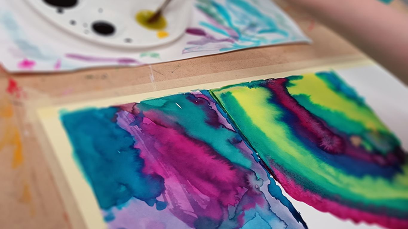 Avoin taidepaja, jonne kaikki museovieraat ovat tervetulleita työskentelemään taiteen parissa.