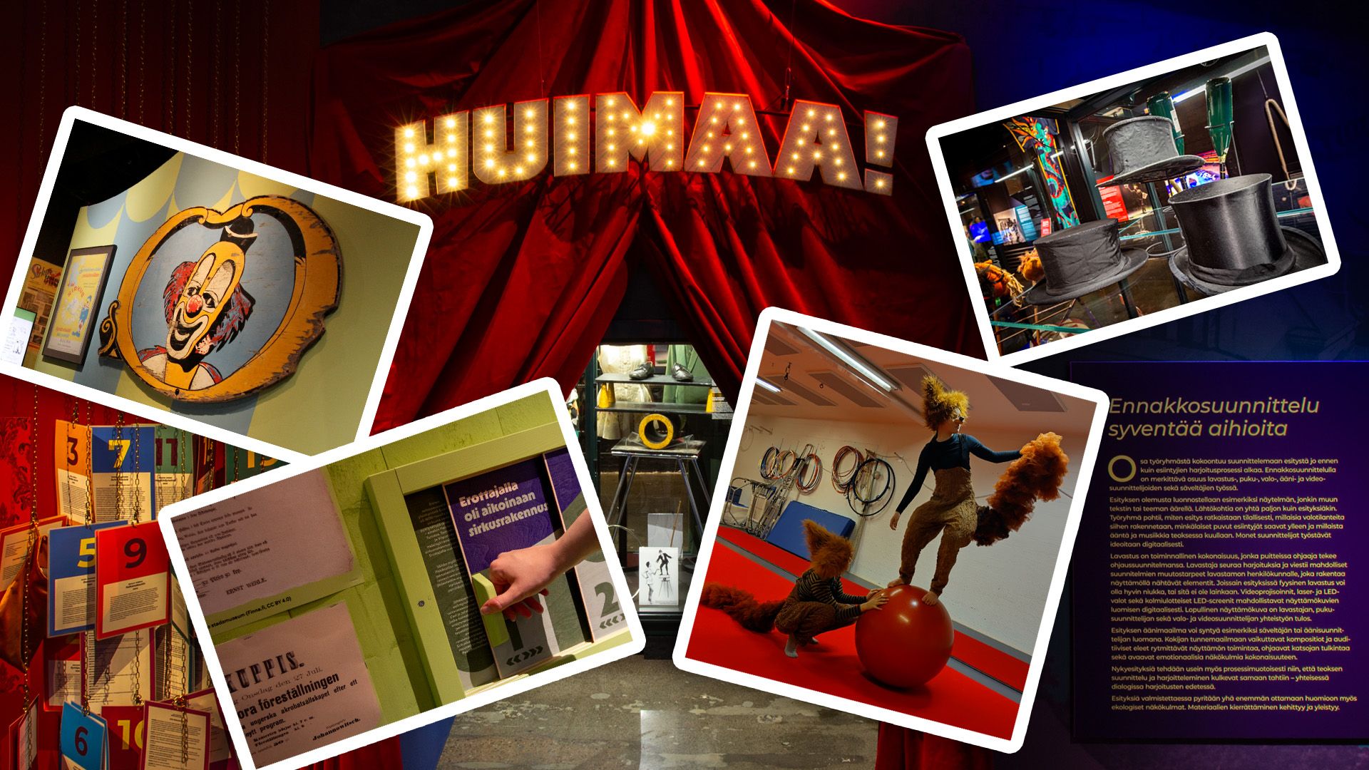 Huimaa! Sirkuksen taikaa ja tarinoita -näyttelyn opastus vie matkalle suomalaisen sirkuksen historian eri aikakausiin ja muotoihin alkaen 1800-luvun kiertävistä seurueista aina nykypäivän kansainvälisiin nykysirkustaiteilijoihin asti.