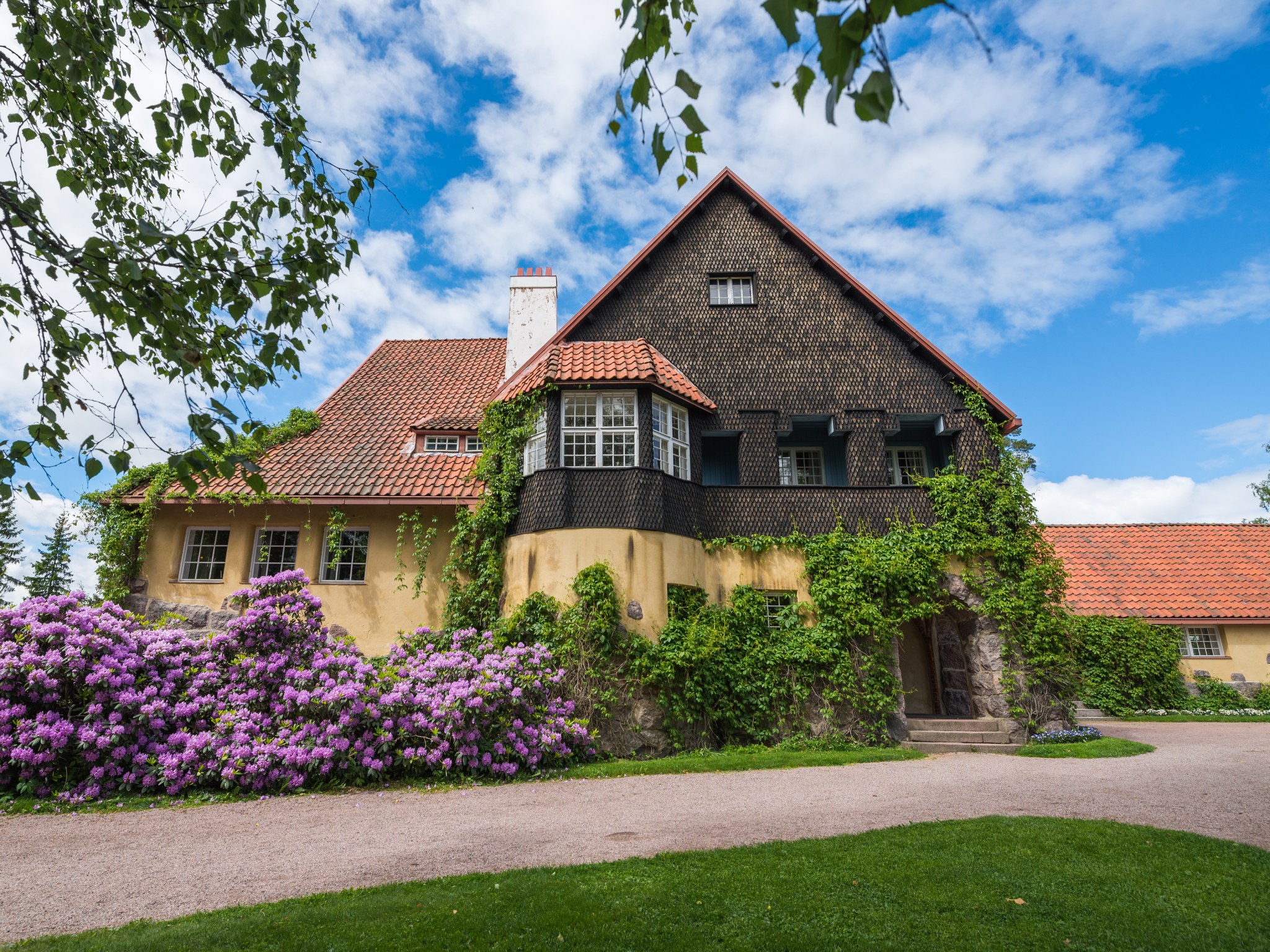 The architect trio fell in love with the landscape of Lake Vitträsk and built a studio home in the natural romantic style out of logs and natural stone. Hvitträsk, completed in 1903, is a unique, comprehensive work of art that attracts design and architecture enthusiasts from Finland and abroad each year.