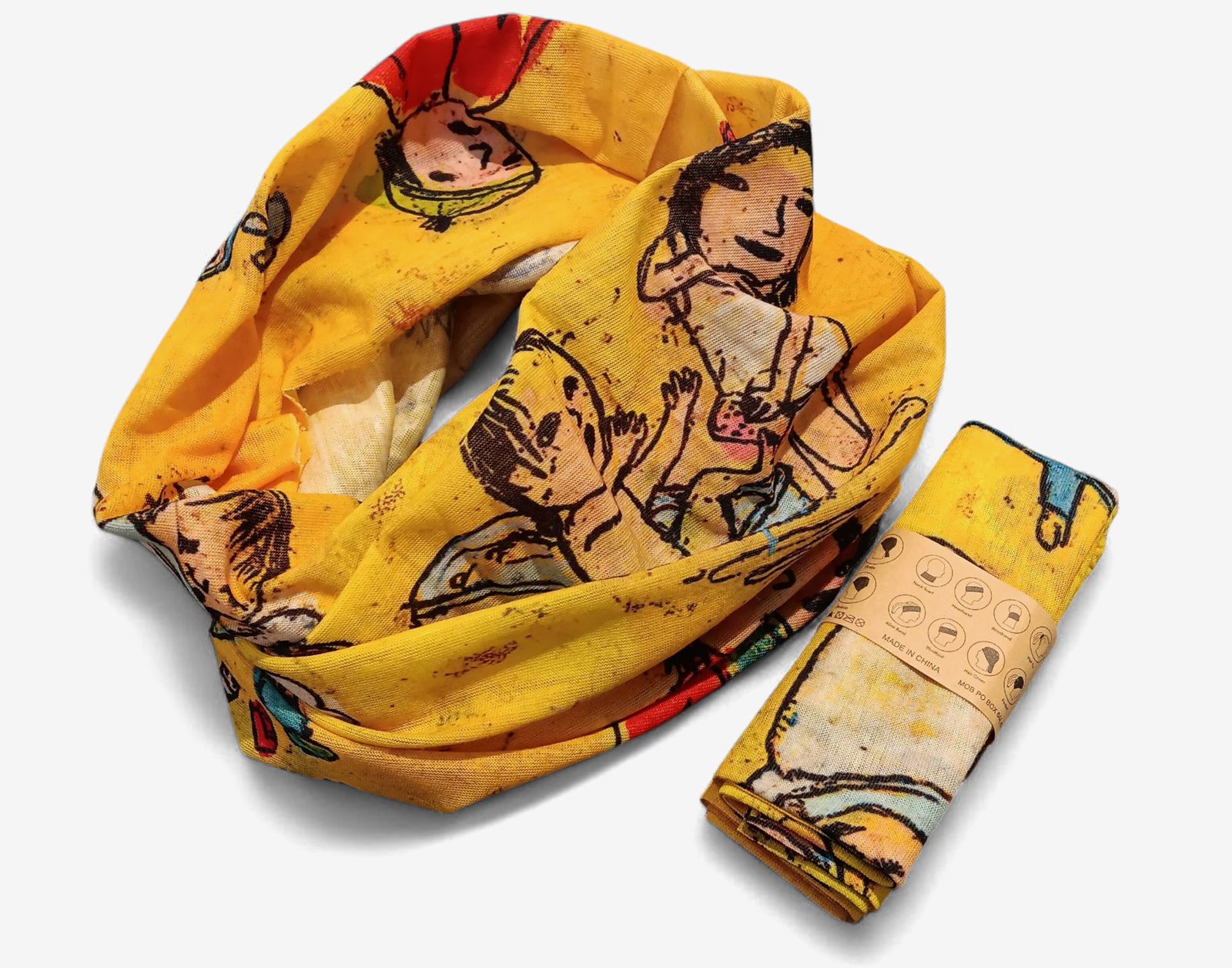 Kaunis keltainen Anna Seppälän ”Päivän sää” taideteoksesta valmistettu lasten tuubihuivi.