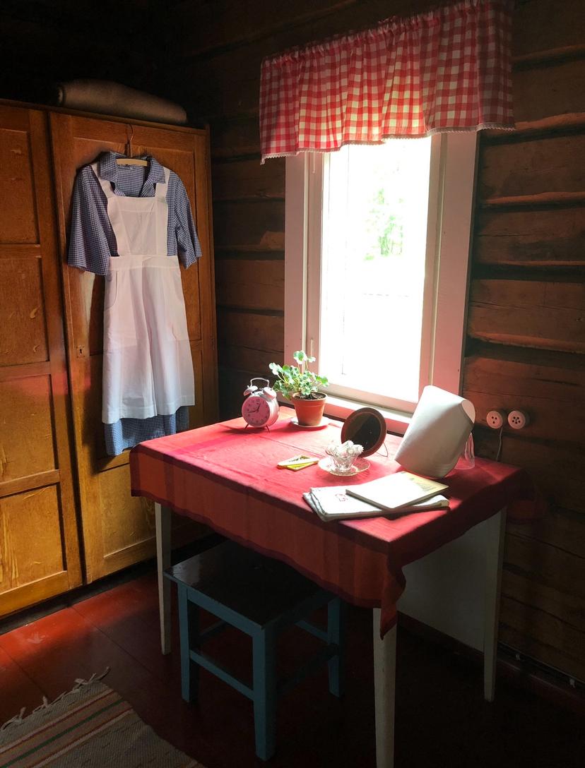 Behind the kitchen in Ahmakuusikko cabin is a small hostess' room. The cabin hostesses, or as it was said in Lapland the camp cooks, had to do a difficult but valuable job ensuring the jacks' nutrition, cleanliness, and other such maintenance while at the logging camps.