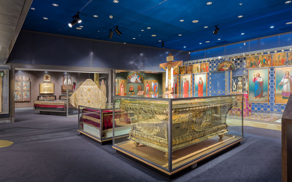 RIISAssa ikonitaide, kullalla ja jalokivillä koristellut sakraaliesineet, upeat tekstiilit ja keisarilliset lahjat viestivät ainutlaatuisesta kulttuuriperinnöstä. Sodista pelastetut aarteet kertovat kohtalokkaista tapahtumista ja selviytymistarinoista. Nykypäivä on läsnä modernissa kristillisessä kuvataiteessa. Museokokemusta täydentää Museokauppa Pikku-Bysantti.