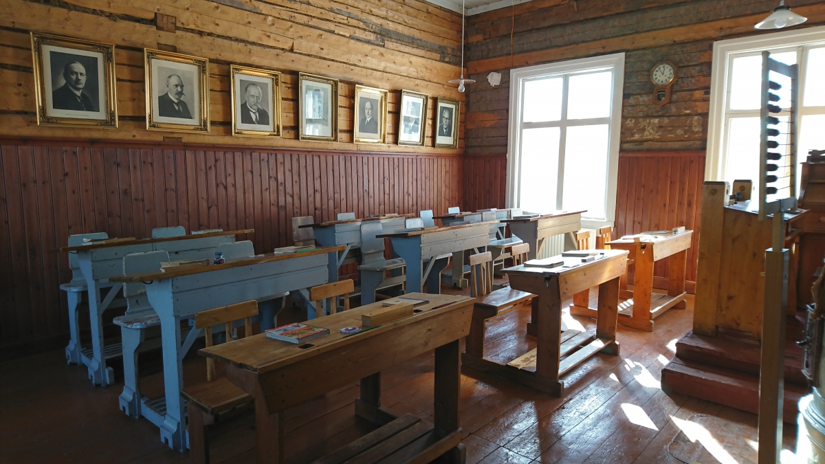 Kansakouluinteriööri 1920-luvun luokkahuoneessa, Nurmijärven ensimmäisen, vuonna 1873 rakennetun kansakoulun rakennuksessa.