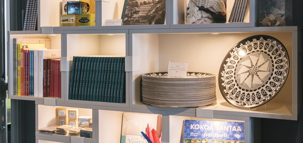 Pienestä museopuodista voit ostaa muun muassa Vantaa-aiheisia kirjoja, lahja- ja muistoesineitä sekä postikortteja.
