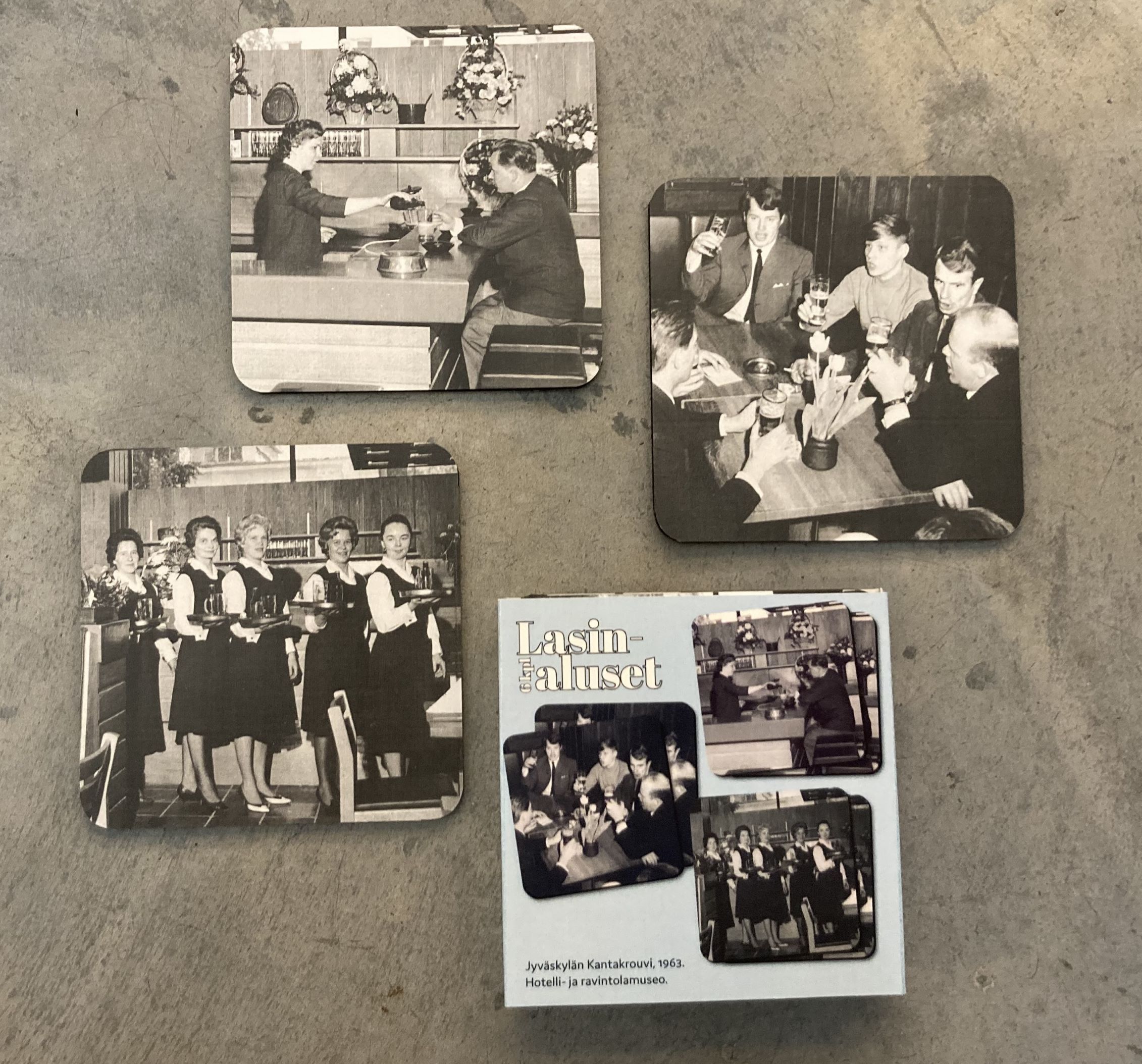 Hotelli- ja ravintolamuseon museokaupassa myynnissä oleva paketti sisältää 6 kpl lasinalusia, joissa on kolme erilaista mustavalkoista valokuvaa 1960-luvun Kantakrouveista. Paketin normaalihinta on 23 euroa. Näyttämällä Museokorttiasi kassalla saat paketin hintaan 21 euroa eli kahden euron alennuksen. Tuote liittyy museossa esillä olevaan Kuohuvat kymmenet -näyttelyyn, joka käsittelee 1960- ja 1970-lukujen ravintolaelämää.