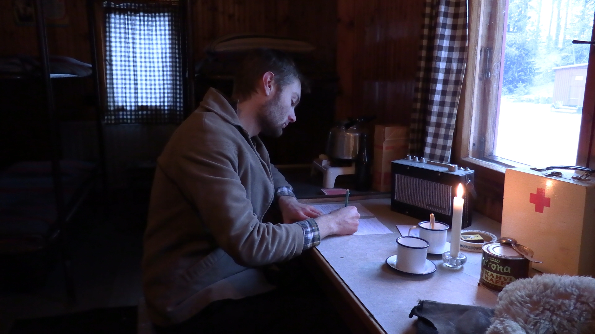 Nuori työmies kirjoittaa asuinparakissa kirjettä kotiin. Kirjeessä hän kuvaa parakkikylien korutonta arkea ja koti-ikäväänsä. Roolissa Juhani Karppila.