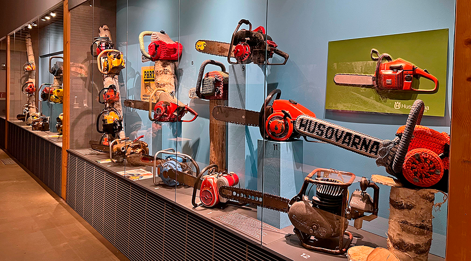 Näyttely esittelee yli 40 moottorisahaa museon kokoelmista. Mukana on myös virkattuja moottorisahoja, veistoksia ja kuvia.